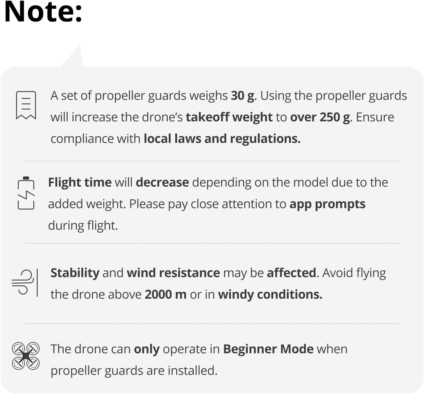 Using the propeller guards will increase the drone's takeoff weight to over 250 g. Ensure compliance with local laws and regulations.